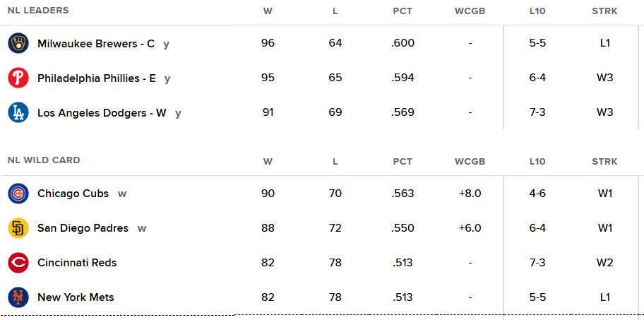 The result? Cincinnati controls its destiny. With a 2-0 record, it's the Reds who would be heading to Los Angeles to take on the Dodgers. Because yes, the last club to qualify will officially begin its playoffs in L.A.