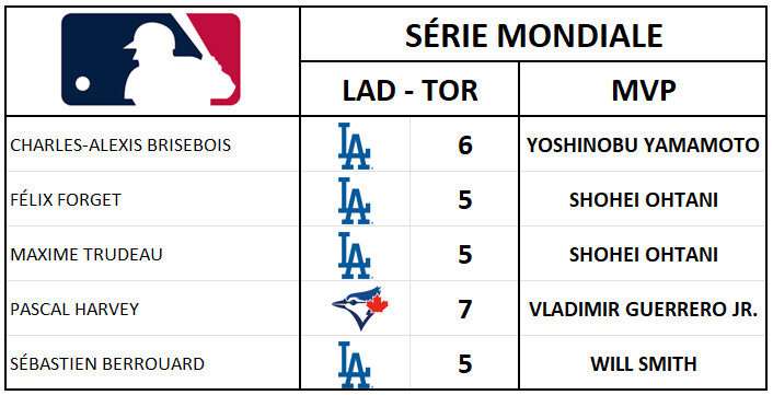 Maxime Trudeau: Los Angeles in 5. Basically, of the 11 other teams in the playoffs, I thought only the Phillies could beat them. Which they did, one game! The Dodgers know tobacco, adapt to any situation, never panic, have incredible depth and are rested. They'll continue to ruin baseball.