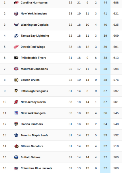 So it's easy to understand why no team has yet officially declared itself a seller in the East. In the West, the Avalanche sit atop the standings with 53 points, while the Canucks are dead last with 27. Hence the Quinn Hughes deal in Vancouver.