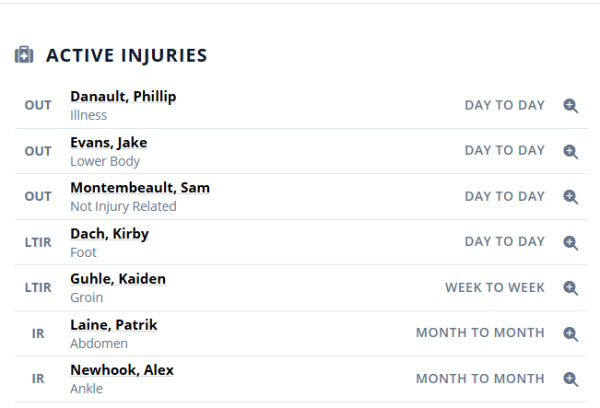 On the other hand, Kaiden Guhle, Patrik Laine, and Alex Newhook are not very close to a return to action and have already missed several games.