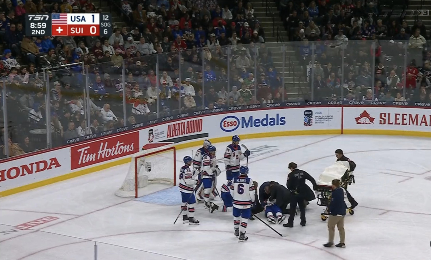 Play was quickly stopped and the medical staff immediately intervened. After several minutes of assessment on the ice, the American defenseman was immobilized and carried off the ice on a stretcher, as his teammates and fans looked on in concern.