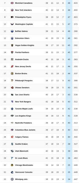 The Senators (19th), Leafs (22nd), Flames (26th), Canucks (31st), and Jets (32nd) are among the worst clubs in the league.