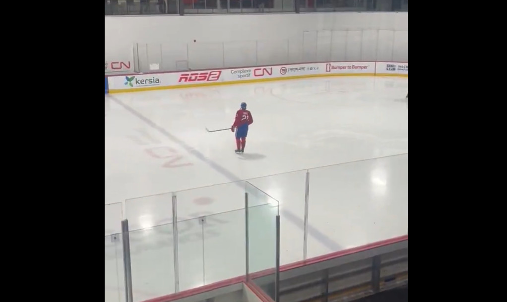 Jacob Fowler is the first on the ice this morning. He discusses his technique with Éric Raymond.