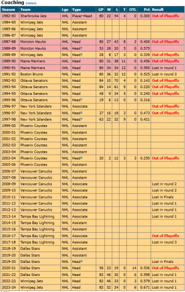The Blue Jackets are young… and Bowness has plenty of experience behind the bench of an NHL team. He spent a few years in the AHL, but his record is still pretty impressive, even if he was never able to win the Stanley Cup: