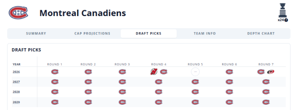 That said, the Habs are equipped to go to war because they're loaded with picks between now and 2029. The Habs have all but their fifth-round picks in the next draft (and they have picks from other clubs, too) for the next four years, and that sure can be attractive to a club looking to rebuild like the Canucks: