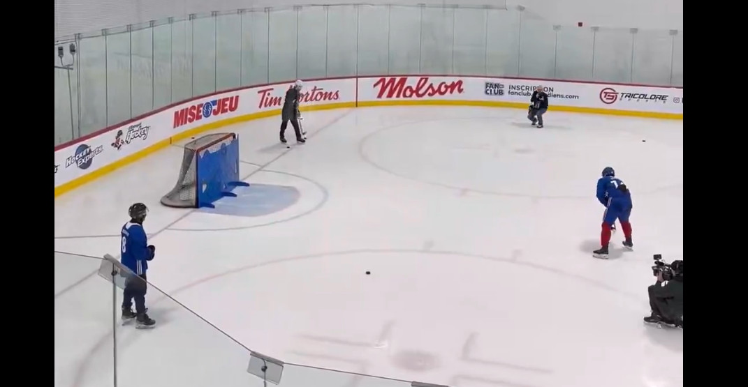 He captured footage of the TVA Sports reporter on the ice with the Canadiens' captain. They were dressed in hockey uniforms and took shots on net.