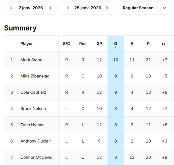Brock Nelson scored two goals this afternoon in the space of a minute and 11 seconds, moving him up the rankings. He added another late in the game to complete his hat trick. He now has 27 goals this season