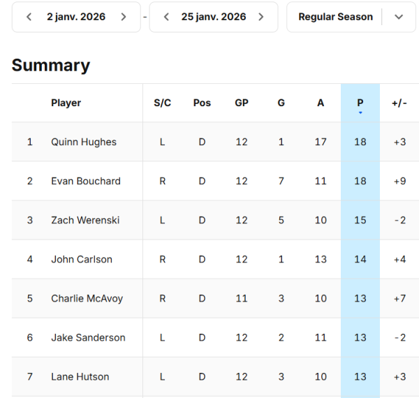He's so intelligent that he's often very well positioned and anticipates his opponent's plays well. What's more, he's still the 4th-highest scorer among defensemen so far this season… at just 21 (soon to be 22).