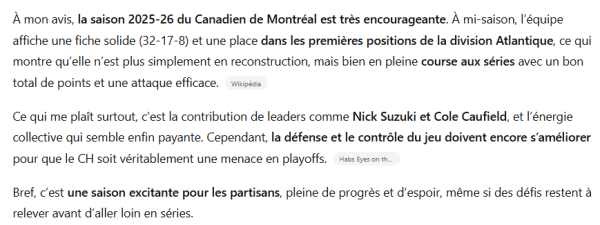 This morning, I had some fun asking ChatGPT what it thought of the Canadiens' season. And the answer surprised me in a way.