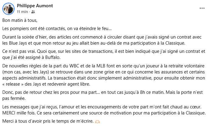 Following these announcements, the Blue Jays appeared to have signed québécois pitcher Philippe Aumont, bringing him out of retirement to add some much-needed depth to their pitching staff.