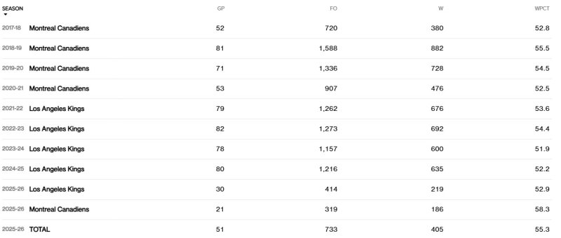 Phillip Danault, as we know, has always been excellent at the face-off circle. He was during his first stint in Montreal, and he was also during his years in Los Angeles.