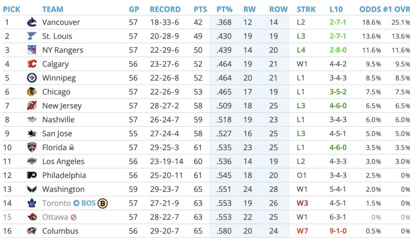 In my opinion, he is still at the top of his class and continues to make teams salivate in the lottery. Right now, the Canucks have the best chance of drafting him, followed by the Blues, Rangers, Flames, and Jets.