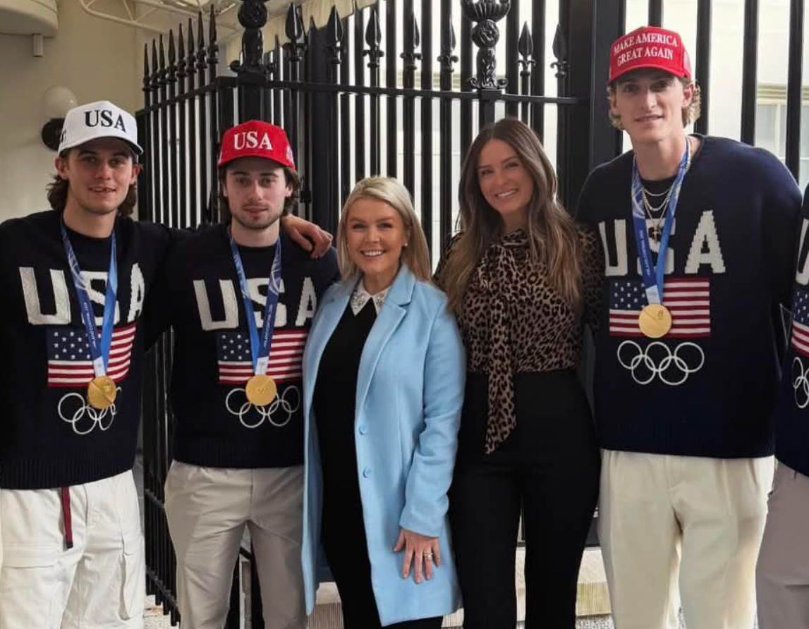 A photo of Karoline Leavitt surrounded by several American players (including the Hughes brothers and Tage Thompson) has been circulating widely on social media since Leavitt posted it in her story.