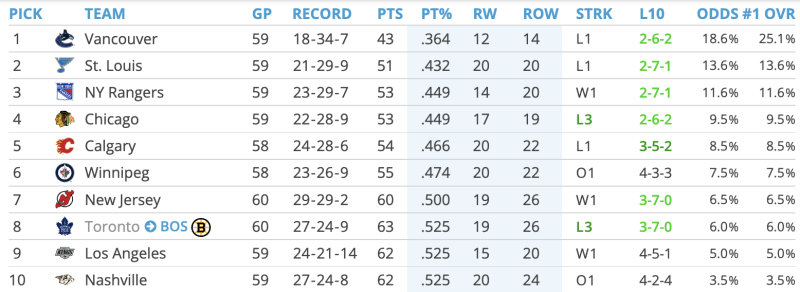 Vegas, which lost 5-0 to the Penguins this afternoon, has 70 points, and the Bruins, who occupy the final playoff spot in the East, have 71.
