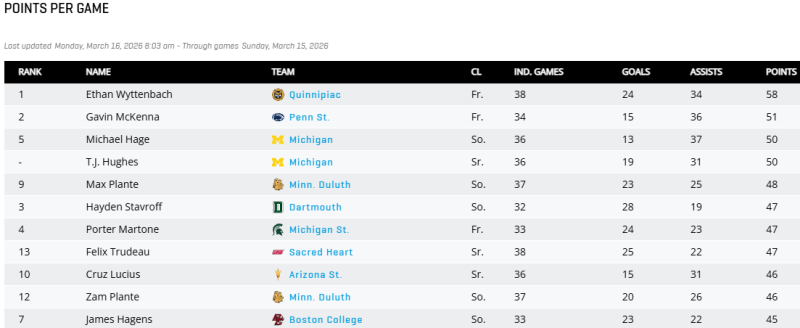 But for whatever reason, Hage isn't among the 10 finalists for the Hobey Baker Award, presented annually to the NCAA's top player.