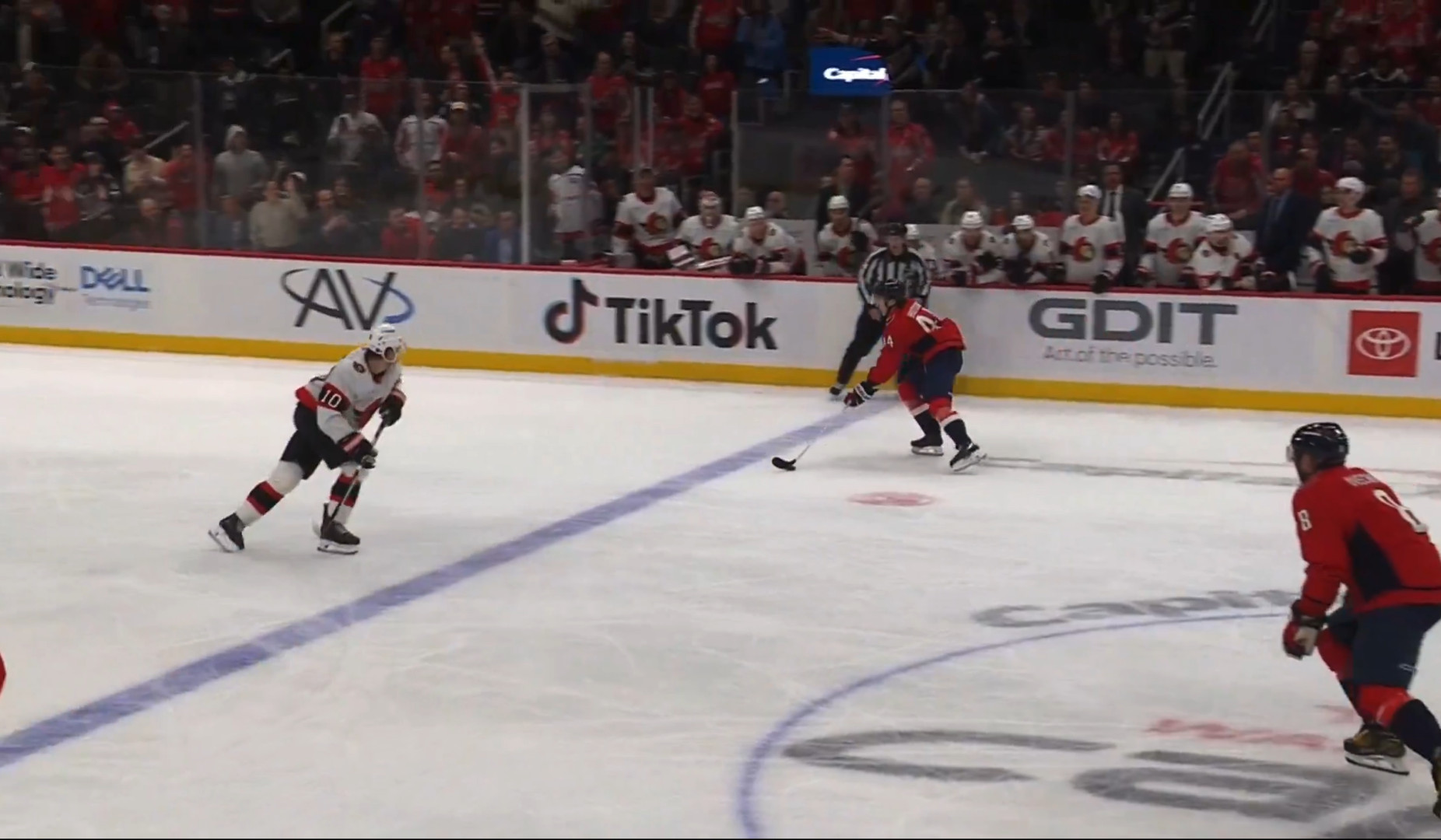 He took advantage of the opportunity to score his first goal late in the game, after the Senators pulled their goalie in favor of a sixth skater. Way to go, Cole!Connor McMichael was telling Cole Hutson to shoot for the empty net the whole way up the ice