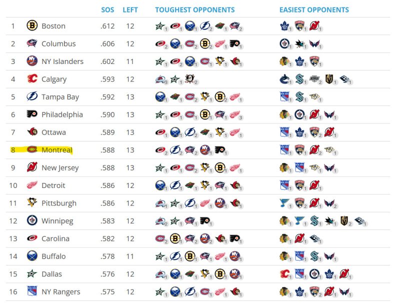However, it's important to understand this: the Habs may be in the top quarter of teams with a tough schedule, but the teams ahead of them—except for the Flames—are in the East.