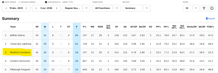 Only the Sabres and the Lightning have outperformed the Habs since then:
