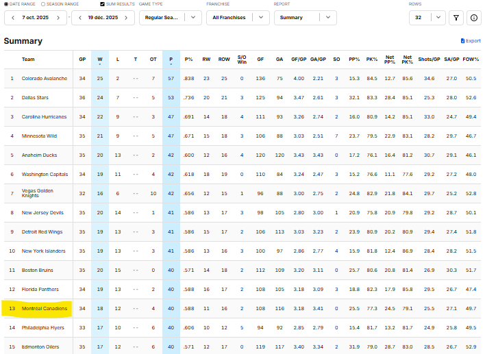 Because from the start of the season through December 19, the Canadiens had a record of… 18-12-4. That was good for 13th place in the NHL standings: