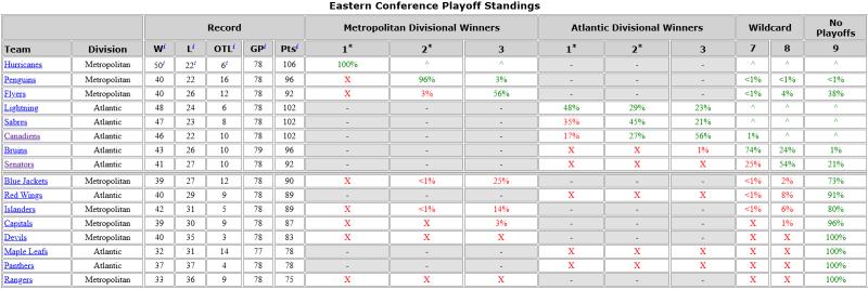 The Bruins, Senators, Red Wings, Islanders, Flyers, Capitals, Blue Jackets, Penguins, and Hurricanes are still possibilities.