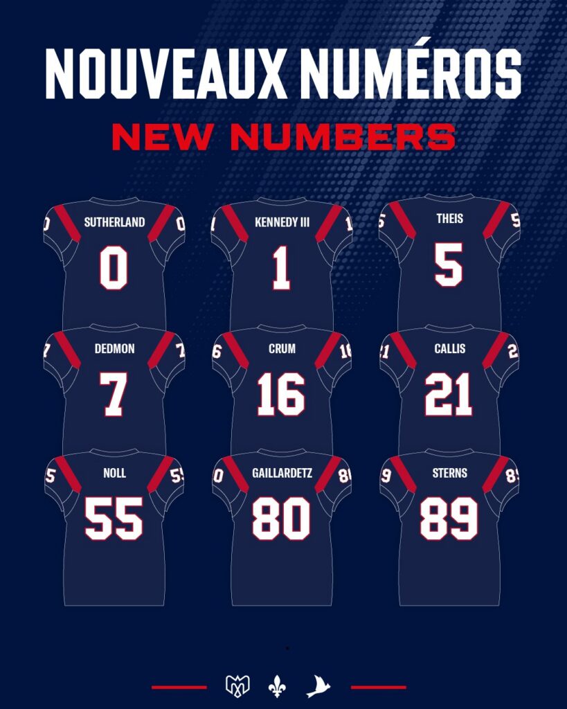 Among other moves, lineman Braydon Noll will wear number 55, while receiver Jerreth Sterns will take over number 89 and look to make his mark in the Montreal Alouettes' passing attack. Young prospect Isaac Gaillaretz will wear number 80 after being drafted from Laval University.