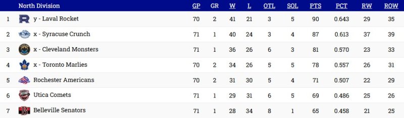 Indeed, with the Syracuse Crunch's unexpected regular-season loss yesterday to the Belleville Senators, the Laval Rocket is guaranteed to finish first in its division.